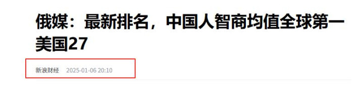 新浪财经2025-01-06 《俄媒:最新排名,中国人智商均值全球第一 美国27》